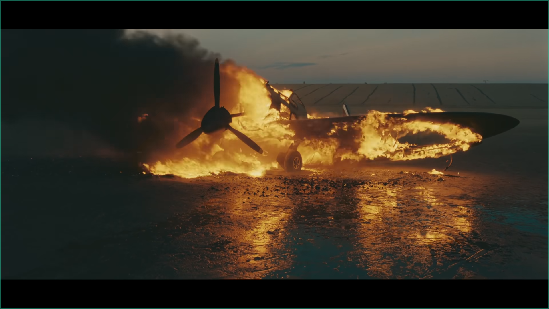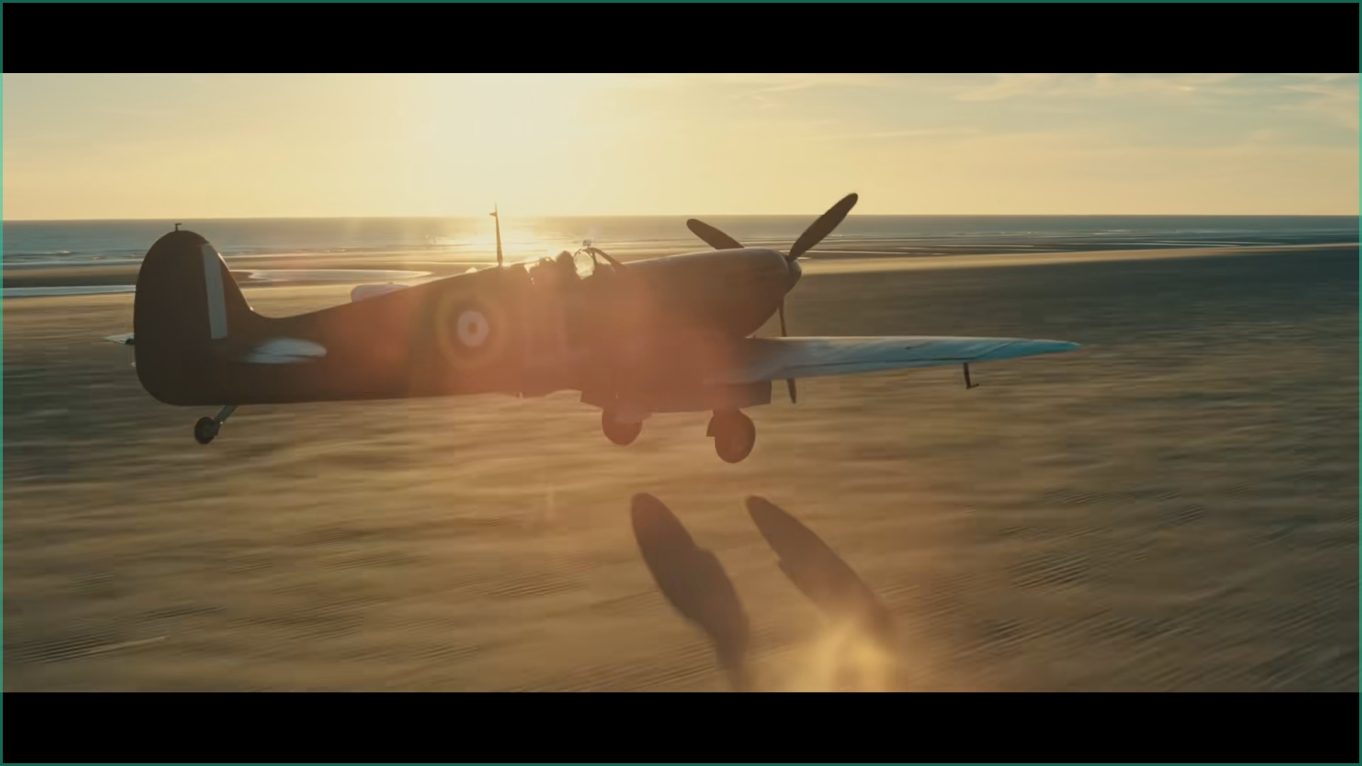 我最难忘的片段有两个,第一个是当在海岸上指挥的海军长官在望远镜里,看到动员来的民用船只星星点点出现在海平面上时候,说出的单词—— $home$,第二个是耗尽全部燃油与敌机战斗的飞行员驾驶飞机,滑翔盘旋并迫降于夕阳下的敦刻尔克海岸上的场景,随后战机熊熊燃烧,伴随着丘吉尔的“永不投降”。