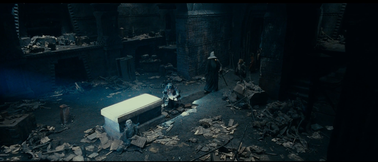 一座城市是指矮人的城市凯萨督姆(摩瑞亚)。这座城市建在山体之下,向下,向四周延伸,坑道众多,阶梯无尽。有着雄浑气派的马萨布尔大厅(Chamber of Mazarbul),这里见证了矮人的辉煌,也见证了贪婪和固执的后果。当看到已经化为骷髅的矮人史官记录下的灭亡史,这愈发渲染出沧桑之感。